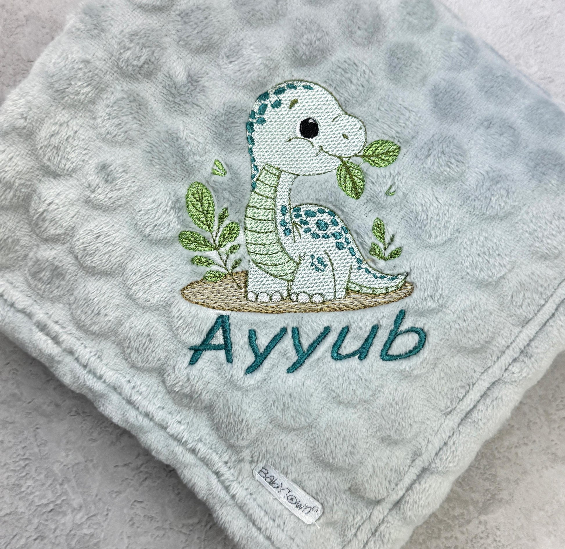 Make snuggle time extra special with this adorable grey velour baby blanket, featuring a charming embroidered dinosaur motif. This sweet little dino, with his gentle smile and leafy snack, adds a playful touch that’s perfect for a baby boy. The soft grey velour has a raised circle texture, offering a lovely tactile feel for little hands and extra comfort for baby.