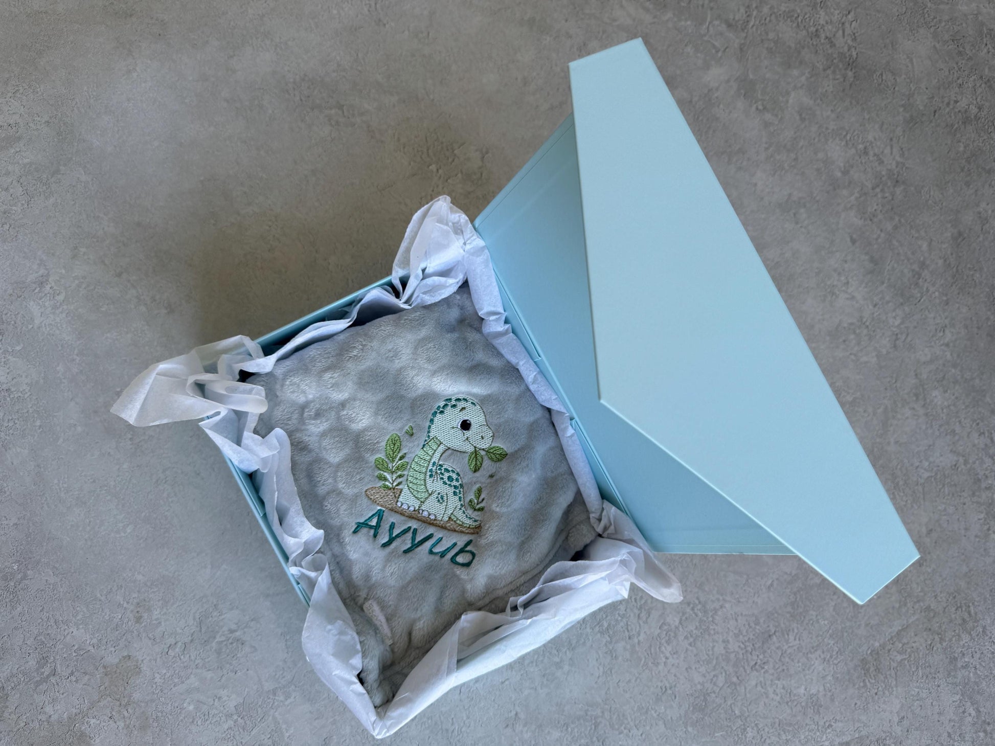 • This Baby Dinosaur Design Grey Velour Blanket is a delightful choice for baby showers. It features a charming dinosaur design, making it a unique gift for new parents. The blanket measures 70cm x 45cm, providing the perfect size for a baby‘s comfort.
